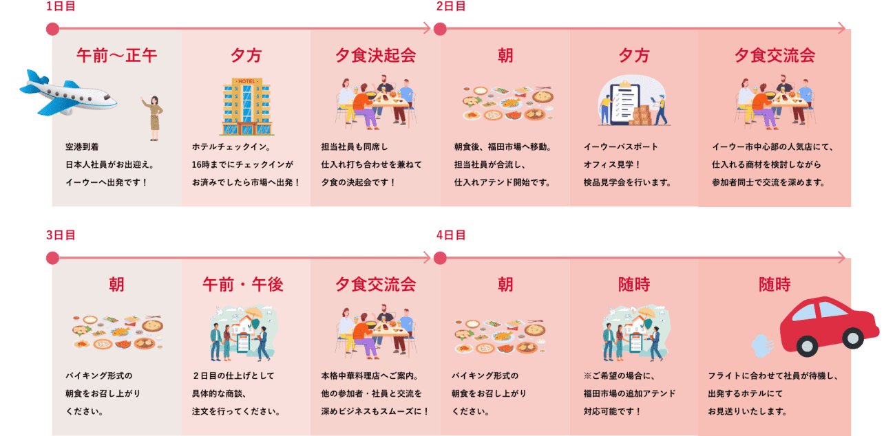 イーウーまでの直行便はございません。上海浦東国際空港まで中国イーウー駐在の日本人社員が待ち合わせ場所から随行します。中国滞在中は全て日本語でサポートいたしますので、お客様は仕入れ業務にご専念ください。※杭州発着プランは専属ドライバー送迎のみとなります。
